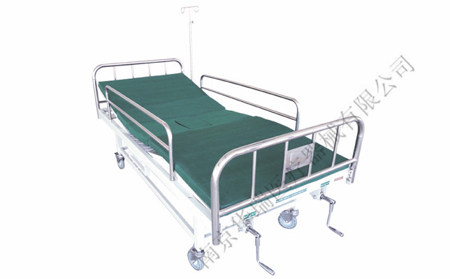结构组成:双摇、不锈钢床头(尾)喷塑床面、喷塑床架、脚轮,抽拉式便盆、插入式护栏。床面折起角:α≥65°γ≥90° δ≥90°。承载重量:240Kg。
