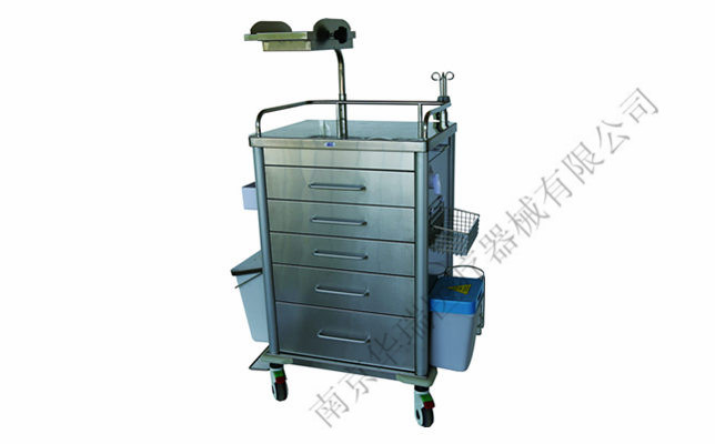 3. 配置:大小五抽、一不锈钢网篮、一不锈钢消毒瓶架、一ABS 药盘,一翻盖垃圾桶,一方形垃圾桶, 组合龙门架,架顶端一仪器托盘架,一伸缩式输液架,右侧与翻盖垃圾桶平齐有一4升氧气瓶托架;